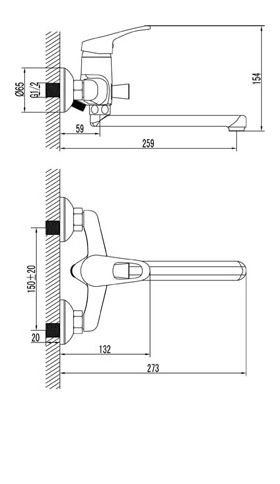 Длина излива у настенных смесителей указана от стены до конца излива/аэратора.