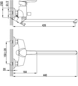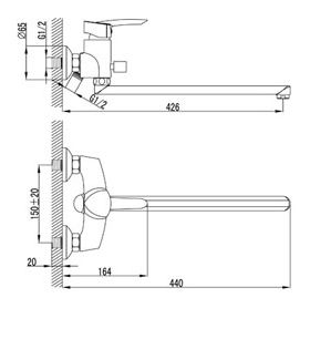 Длина излива у настенных смесителей указана от стены до конца излива/аэратора.