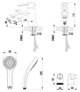 Набор: смеситель и душевой гарнитур представляет собой сложную конструкцию, включающую в себя смеситель с изливом и комплекс в виде штанги (стойки) и шланга с душевой лейкой.