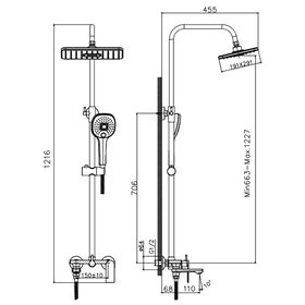 Смеситель для ванны HAIBA HB24505 1-ручный, поворотный излив 110мм, 3-функциональная лейка ш~150в~150мм, шланг 1.5м, с верхним прямоугольным тропическим душем ш291г191мм, с высотой лейки 663-1227мм, габаритная высота 1216мм, глубина 455мм, латунь, глянцев
