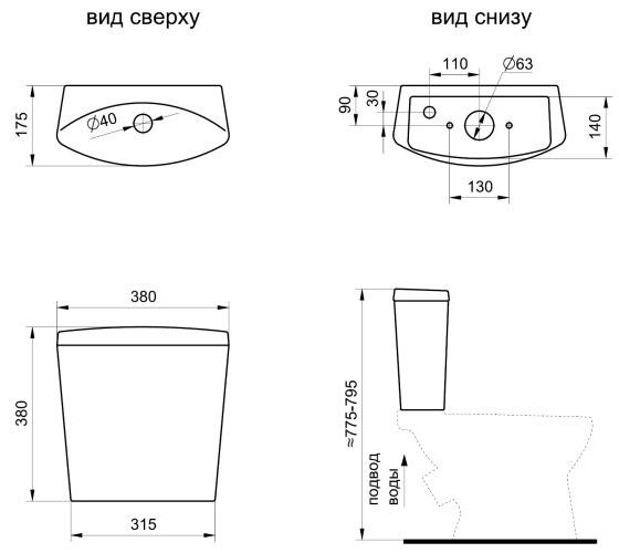 Высота унитаза со смывным бачком и чашей, измеряемая по прямой вертикальной линии от крайней нижней до крайней верхней точки устройства. Для подвесного и приставного унитаза высота будет равна высоте чаши.